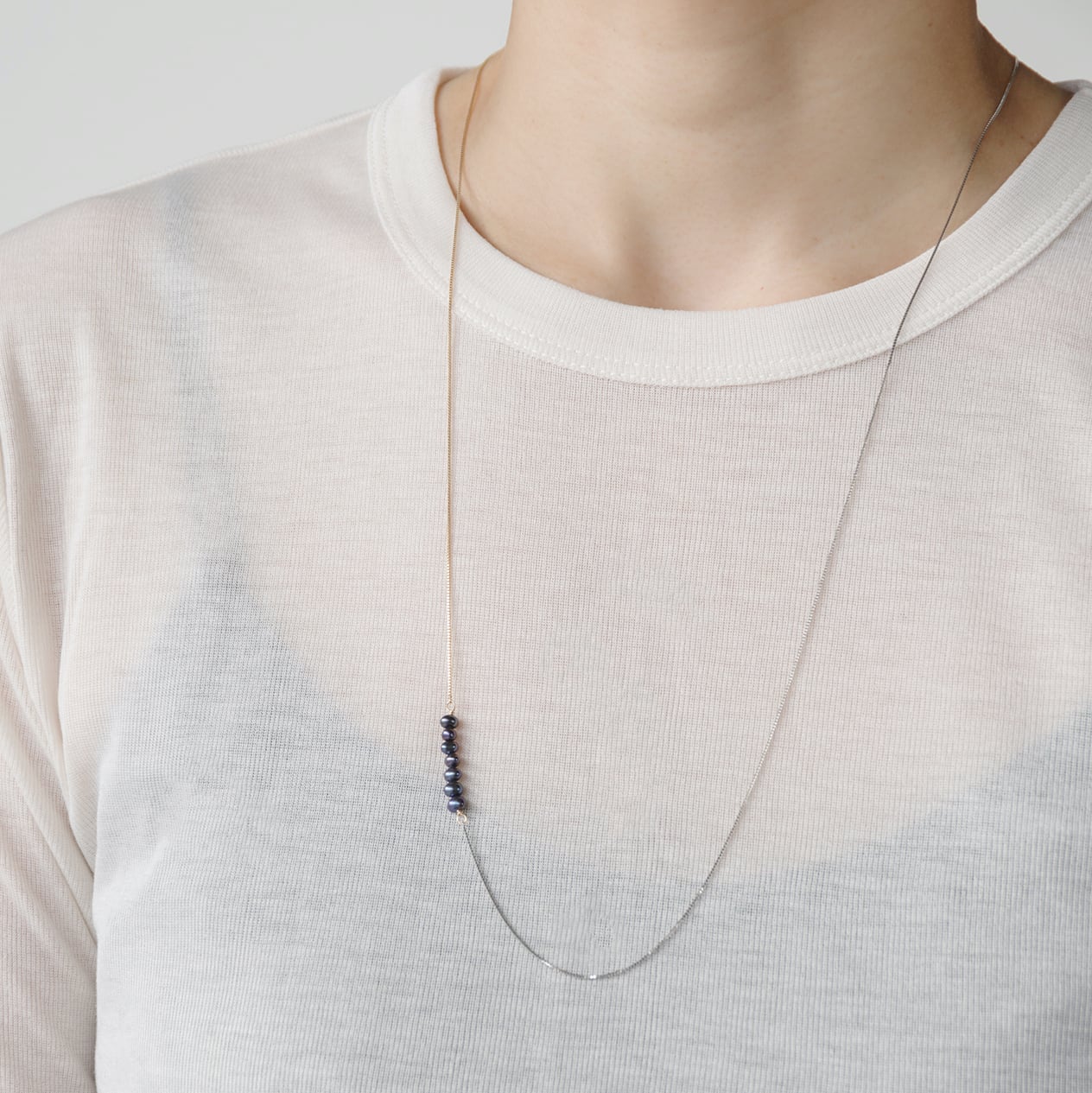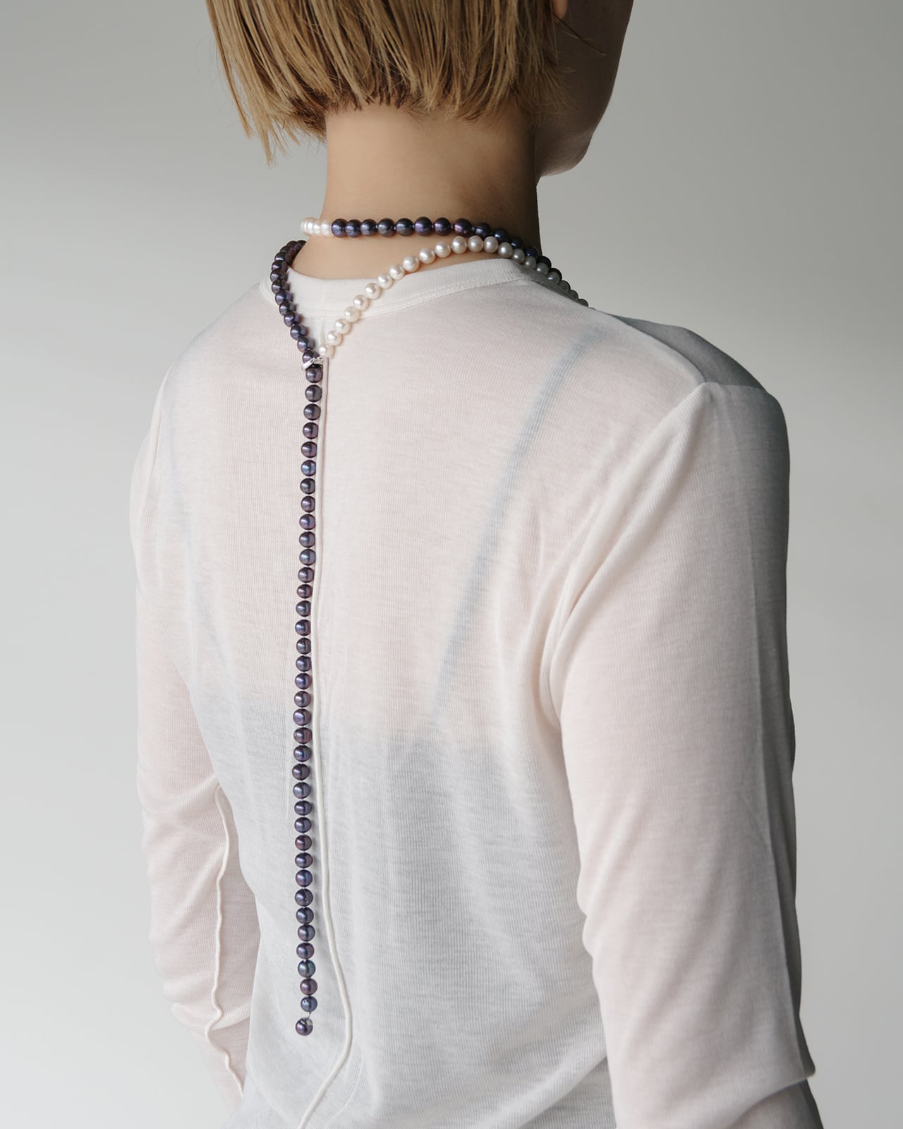 カジュアルにもフォーマルにも活躍する、淡水パールを用いた〈Asymmetry Pearl Necklace〉の中でも、全長164cmのロングデザイン。