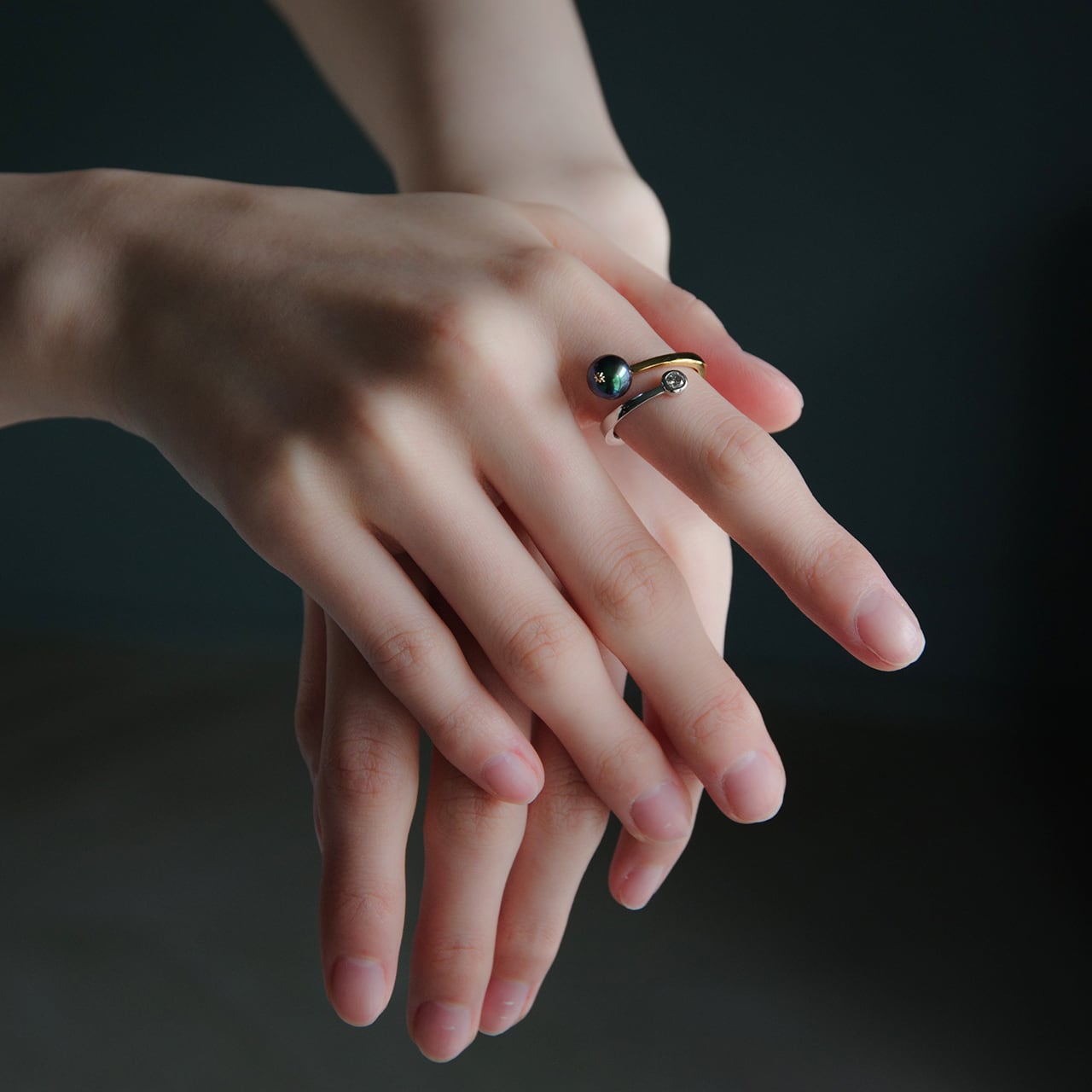 無段階調節でどなたでもぴったり合い、その日の気分やコーディネートに合わせて指を変えられる優れたリングです。 リングの使用感が苦手な方にもおすすめ。 グレーカラーの「Diamond」とピーコックカラーの「アコヤパール」を使い、Shelbyらしいアシンメトリーデザインで上品さとスタイリッシュさを兼ね備えたリングです。