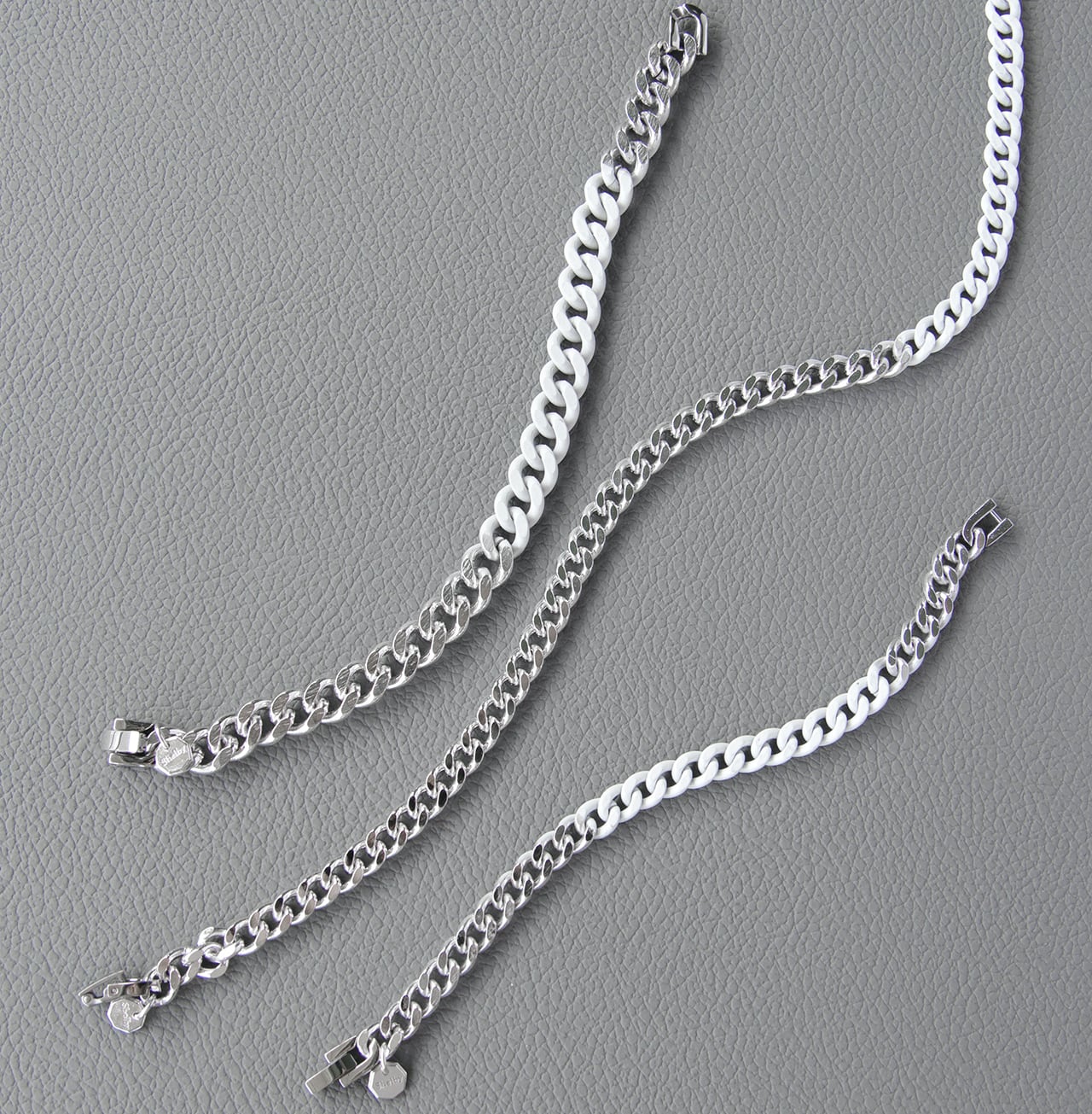 ホワイトはロジウムメッキを施し、白い塗料を重ねた仕上げです。使い込むほどに塗料がかすれ、マットシルバーカラーのチェーンが現れて味わいが増していきます。