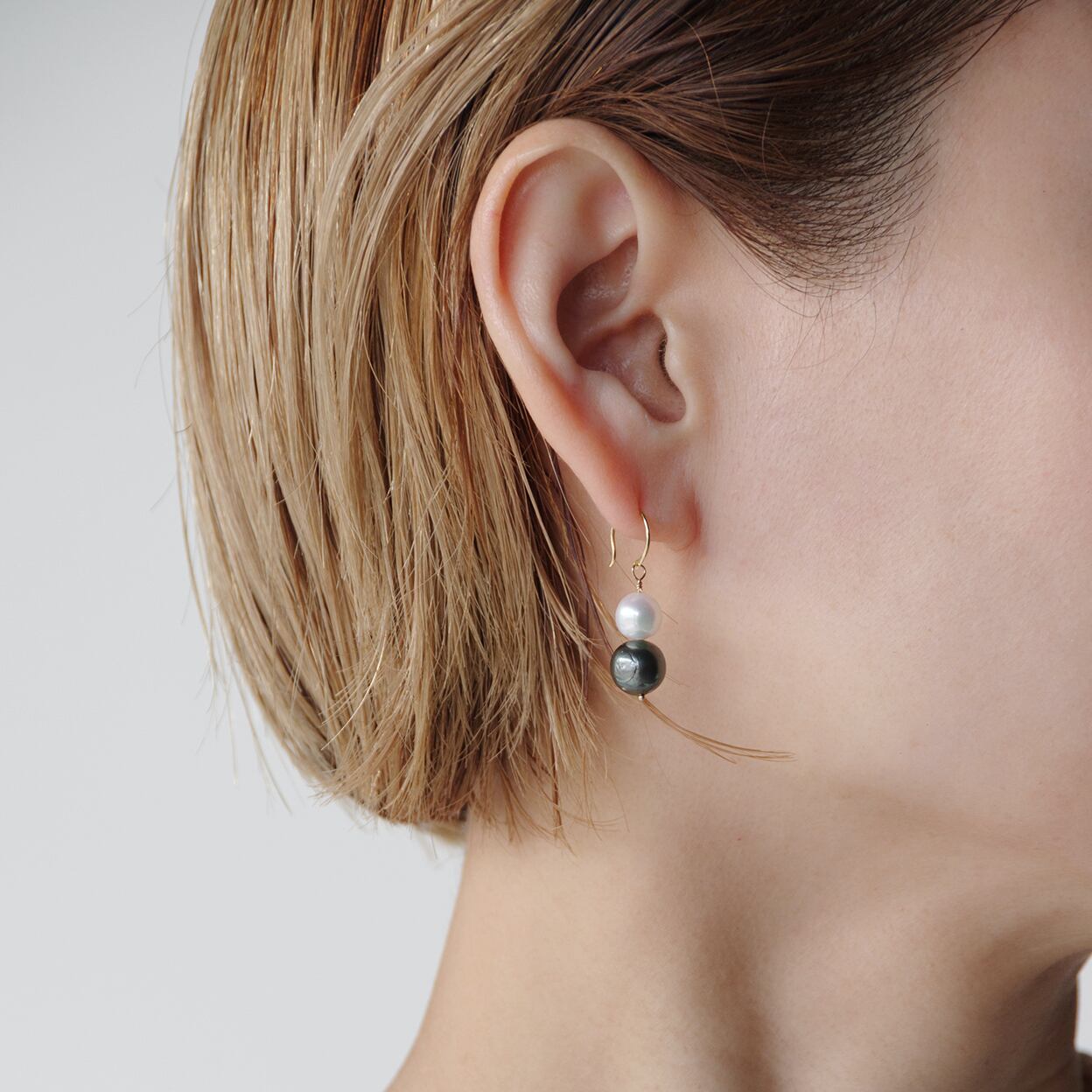 カジュアルにもフォーマルにも使えるアコヤパールとタヒチのブラックパールを使った“Asymmetry Pearl Pierce ”