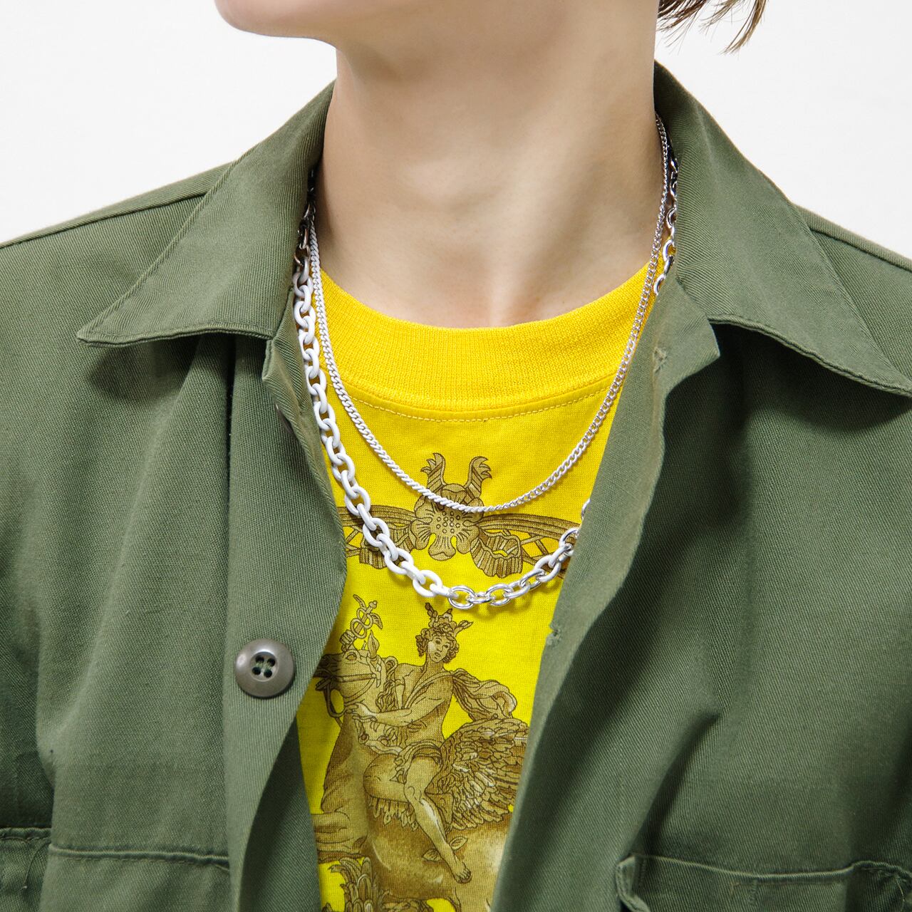 マンテルがデザインのアクセントとなり、どの部分をセンターにしても自然に映える自由なスタイル。ホワイトはロジウムメッキを施し、白い塗料を重ねた仕上げです。使い込むほどに塗料がかすれ、マットシルバーカラーのチェーンが現れて味わいが増していきます。