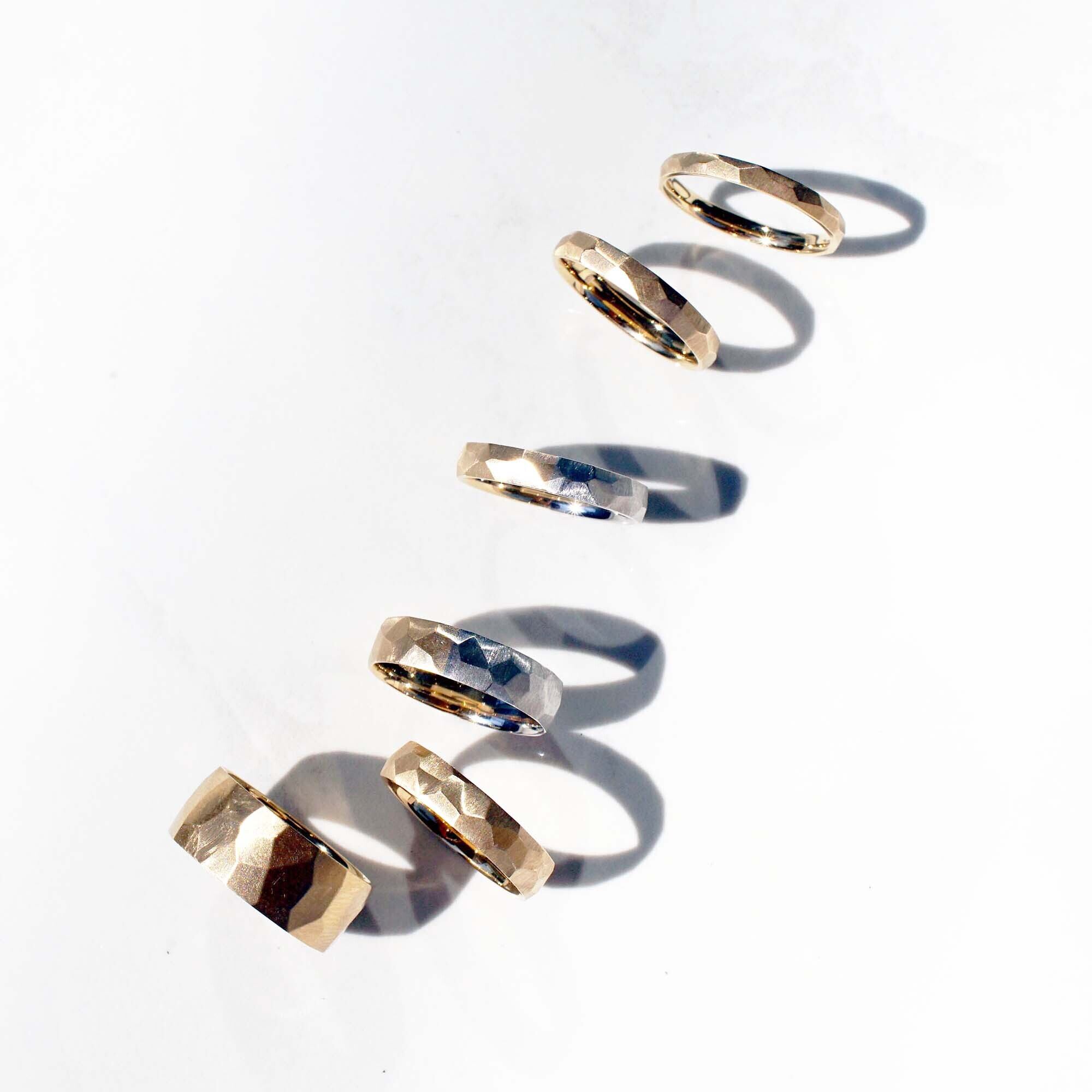 金属を叩き強度を増す“鍛造”の製法を使い、丁寧にひとつずつ削り作られたリングは、同じものがひとつとしてない唯一無二のリング。