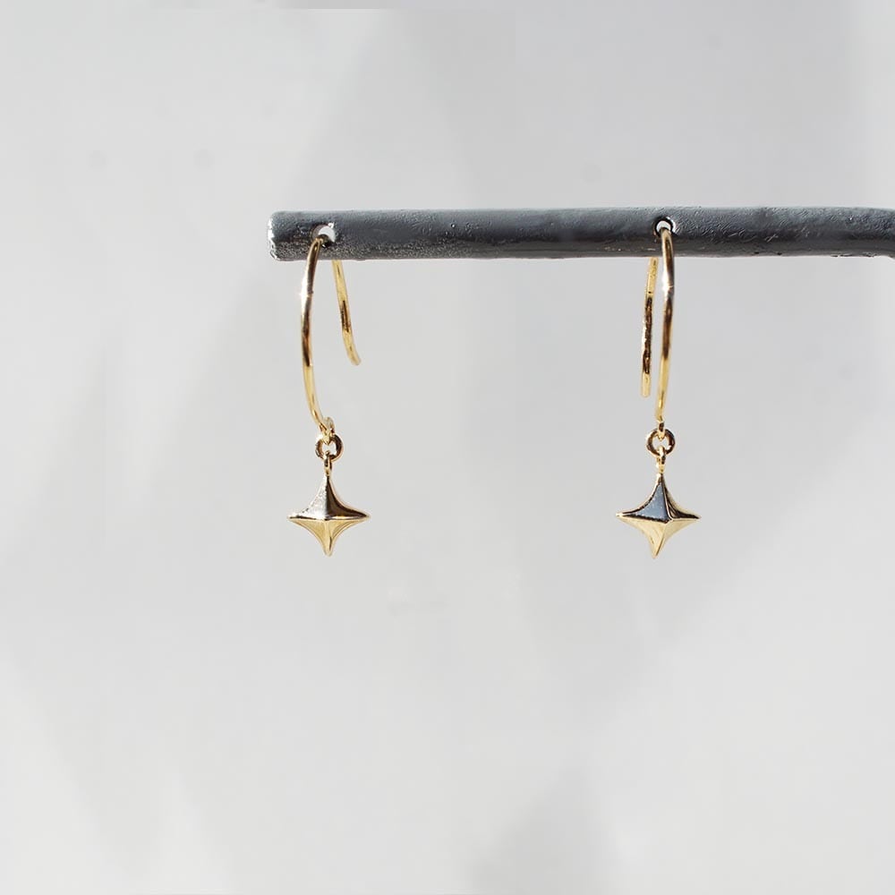 立体的なスターが、K18イエローゴールドのピアスフックで軽やかに揺れるデザイン。動くたびに繊細にきらめき、耳元にさりげない華やかさを添えます。